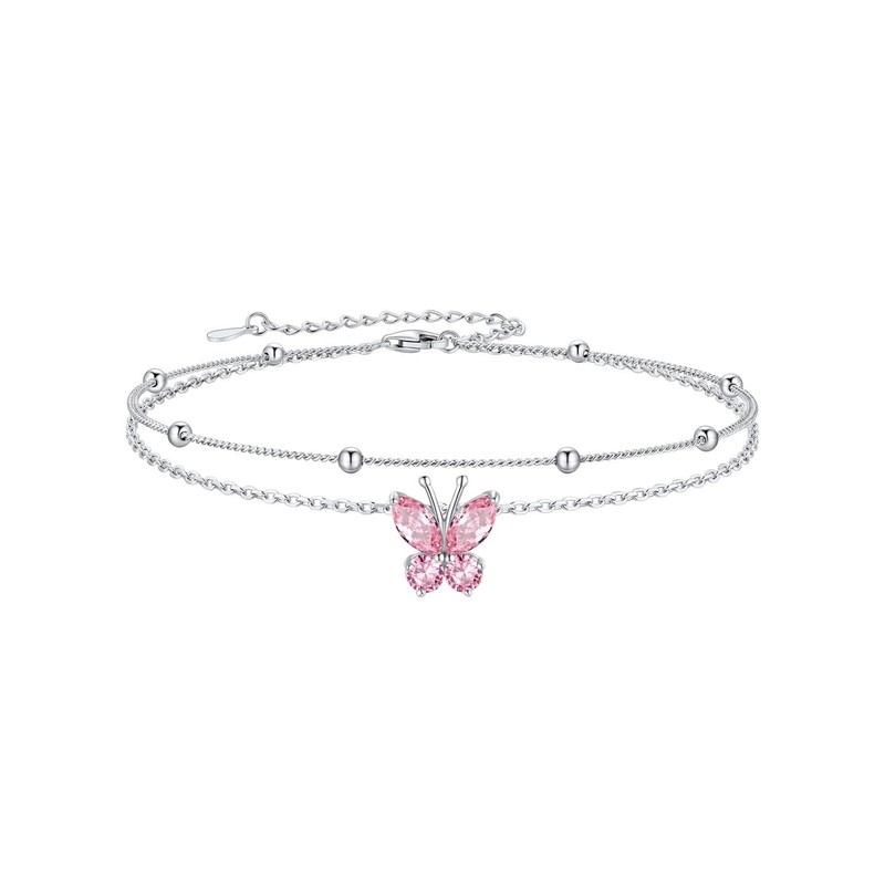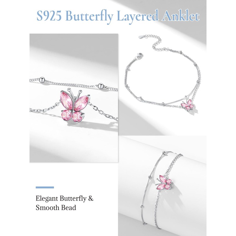 - Sterling Silver Butterfly Anklet - Unique double-layered chain design, vivid butterfly charm chain and polished bead ball chain, sparkling 12 birthstone are made of AAA+ cubic zirconia, simple and elegant, make you sexy and outstanding on the beach. It is a perfect gift for beach lovers.