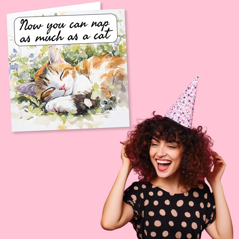 Cute Happy Retirement Card For Loved One - Flowers, Nature Lover - Now You Can Nap As Much As A Cat - For Colleague, Dad, Mum, Grandad, Nan, Grandma, Grandpa, Aunt, Uncle
