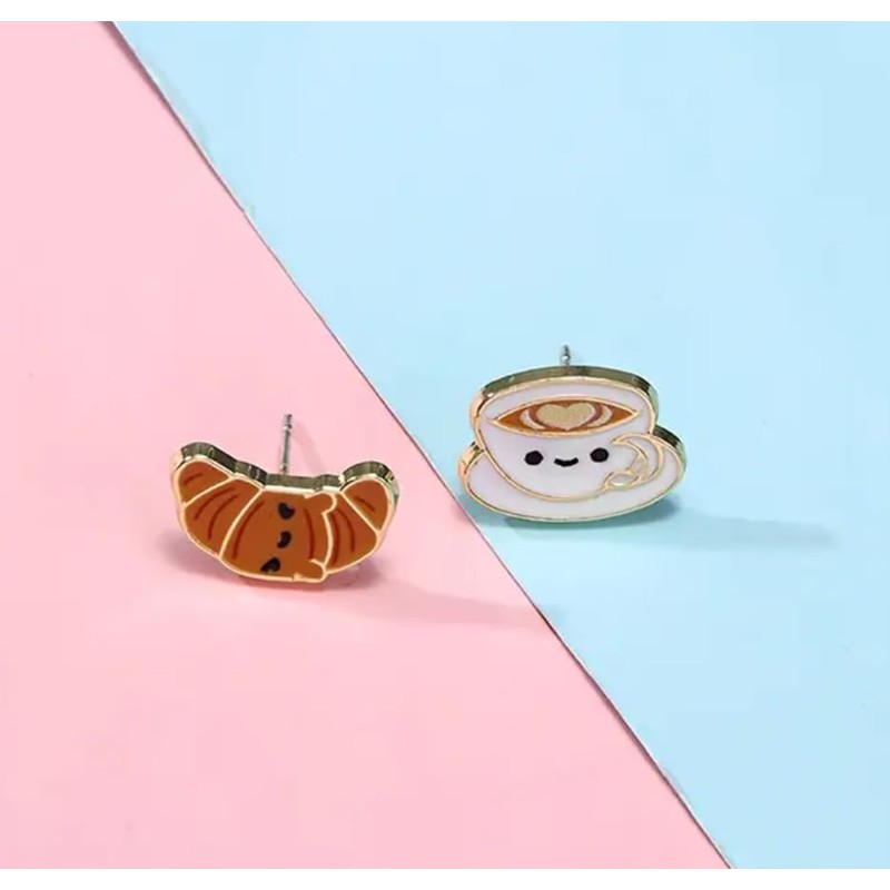 - DESIGN: Adorable mismatched earring set featuring a smiling coffee cup with latte art and a cute croissant with kawaii-style facial features