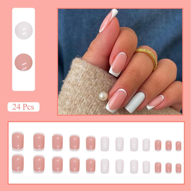 - 【Package Contents】:A box contains 24 fake nails, a nail file and 24 jelly glues, the french square fake nails are divided into 12 different sizes, 48pcs adhesive tabs, prep pad, mini file, cuticle stick, it is convenient for you to choose the fake nails that suit your nail.