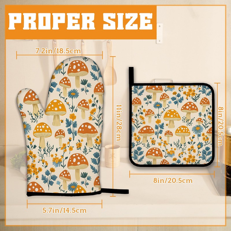 Cute Mushroom Forest Oven Mitts and Pot Holders,Floral Flower Heat Resistant Oven Mitts Gloves and Pot Holder for Home Kitchen Decorations Cooking Baking BBQ Gifts,Set of 4