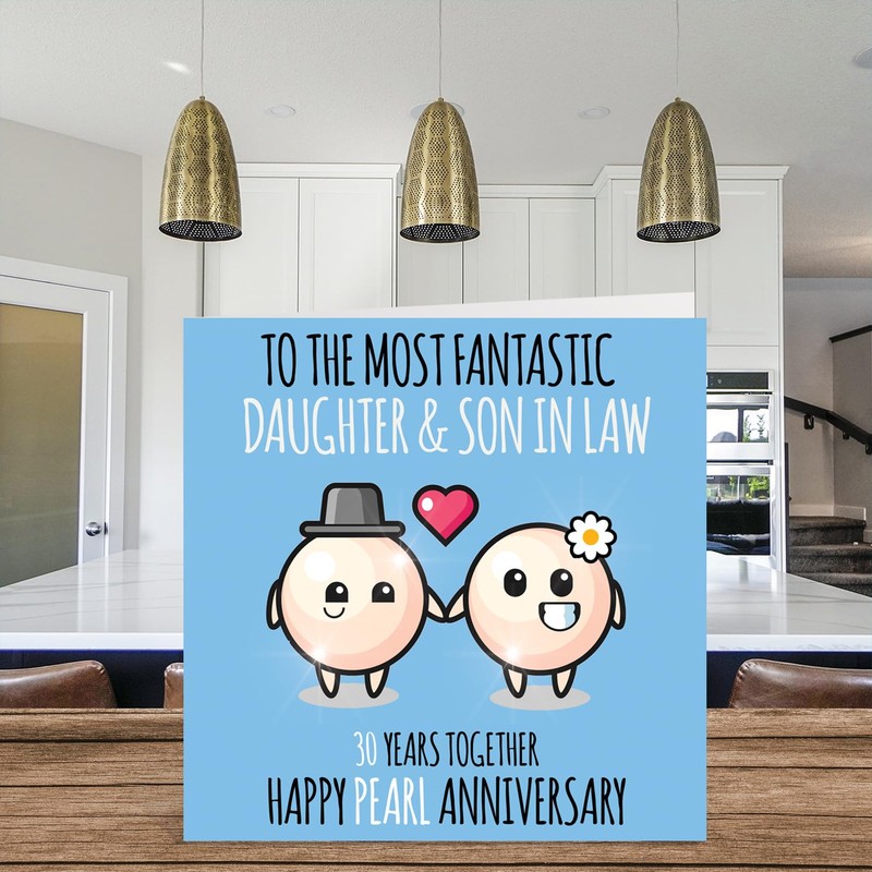 - MAKE THEM SMILE WITH THIS CUTE ANNIVERSARY CARD: This exceptional quality anniversary card for her or him shows the design of a cute pearl couple with the words "To The Most Fantastic Daughter & Son In Law, 30 Years Together, Happy Pearl Anniversary". If you are looking for cute anniversary cards then this card is bound to make them smile.