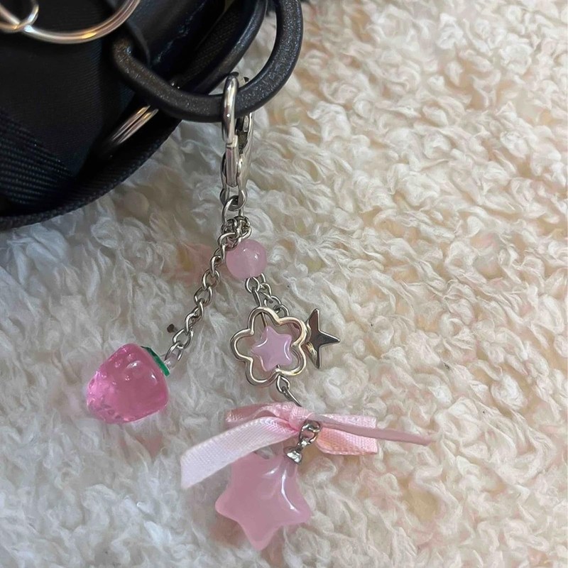 Cute Pink Strawberry Keychain Y2K Keychain Bow Flower Heart Pendant Bag Charms Kawaii Aesthetic Accessories for Women