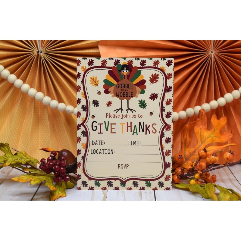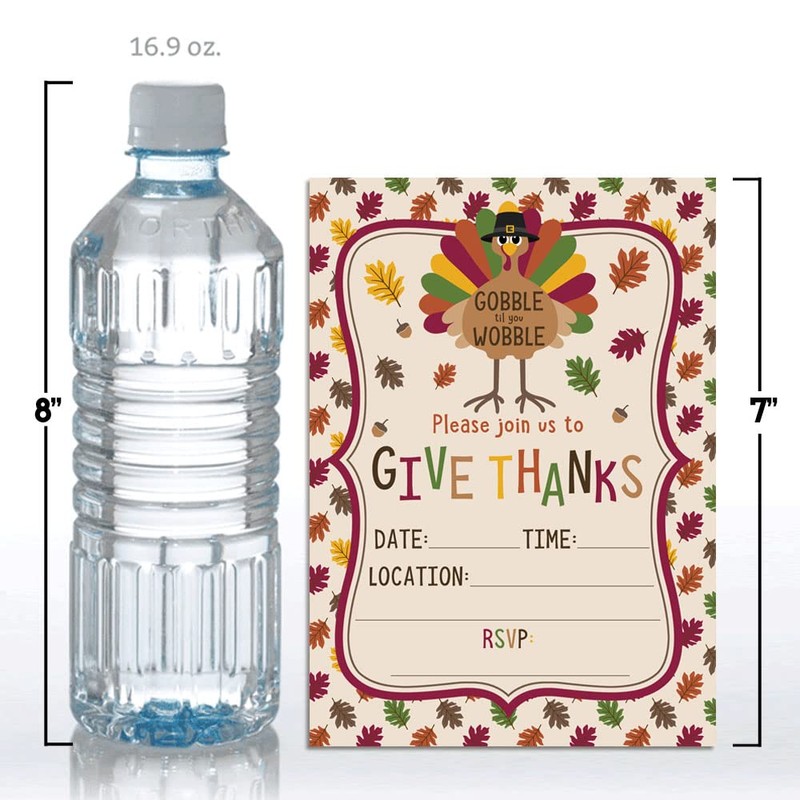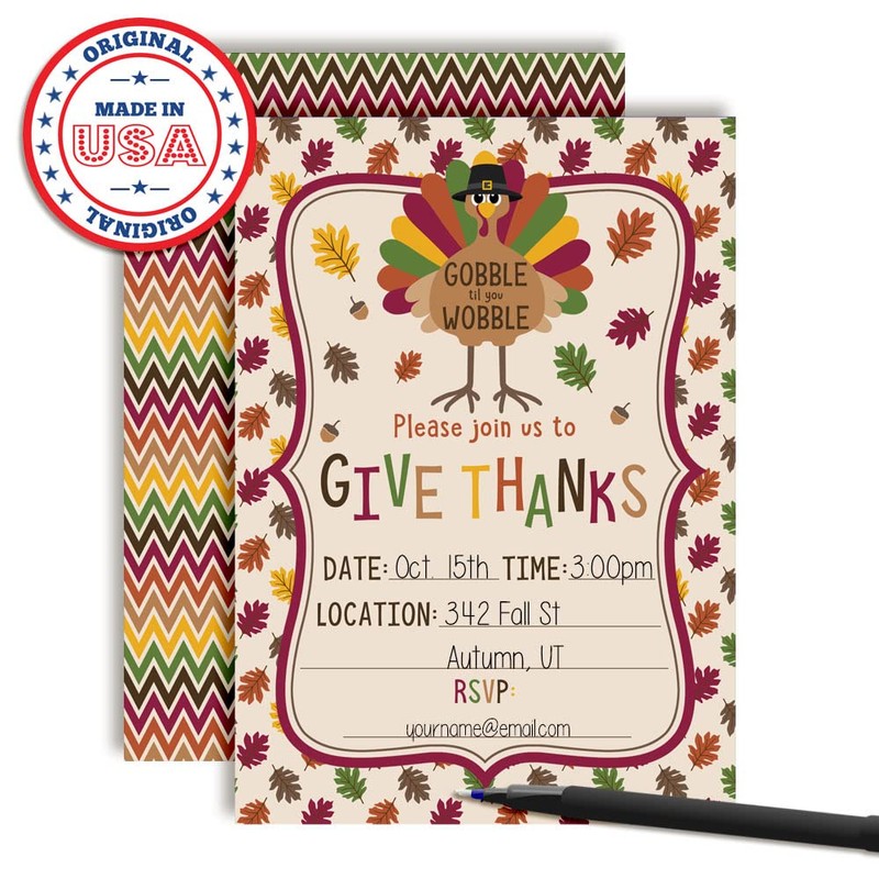 Cute Turkey Gobble Till You Wobble Thanksgiving Party Invitations, 8 Pack 5x7 Fill In Cards with Eight White Envelopes by AmandaCreation
