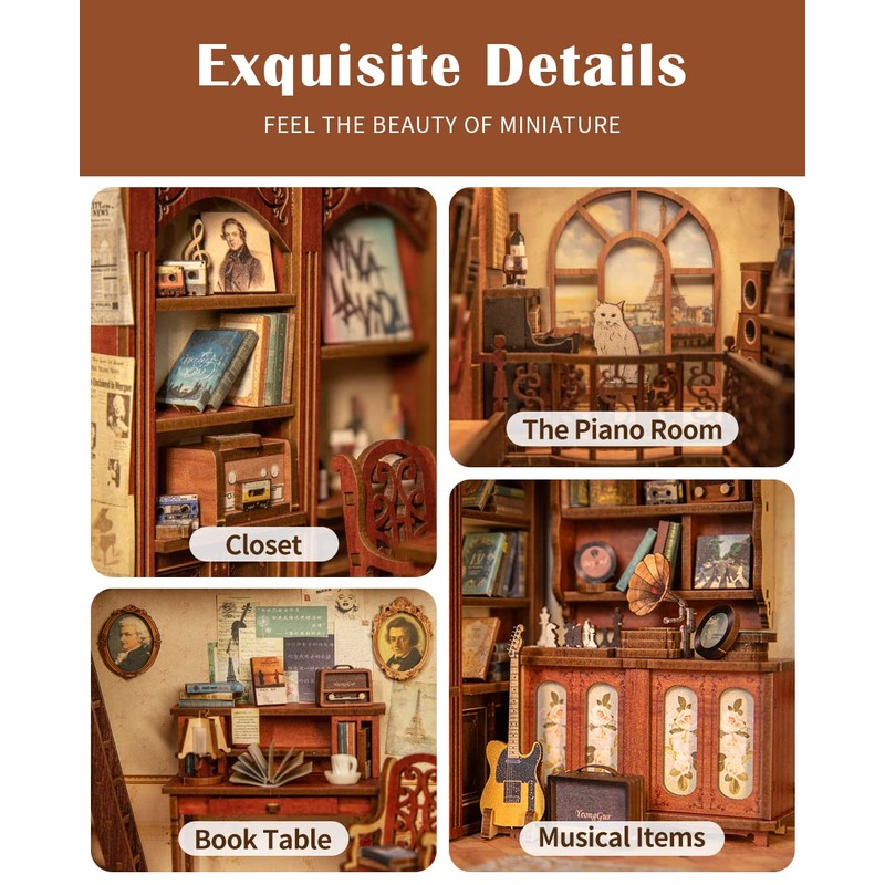 - 【UNIQUE DESIGN CONCEPT】The European classical design takes you on a musical trip. The top and bottom of the book nook reflect a sense of hierarchy; a quick touch switch creates convenience; lighting, furniture, and specific music components decorate to display a sense of full of details, such as guitars, phonographs, records, and so on. Enjoy the happiness of the music theme in the making process.