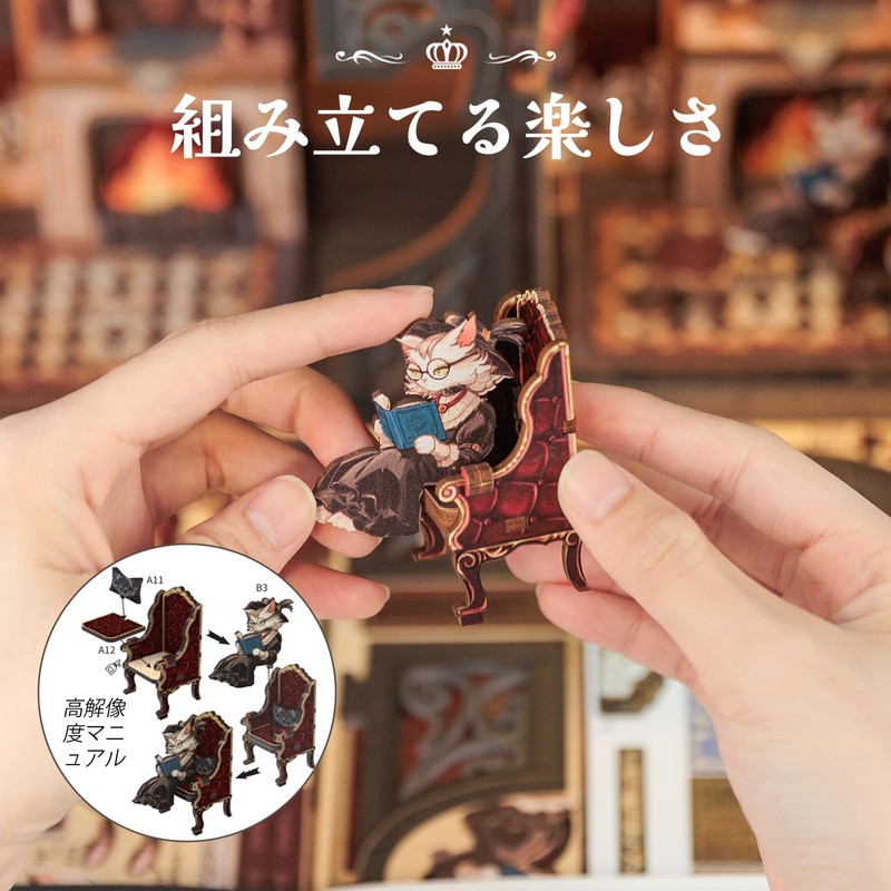 Miniature house model, dollhouse kit and booknook kit are gorgeous, comfortable, and like a private cave of a cat, adorning the study of a cat. Through the unique cat head door frame, the mysterious atmosphere isolates us from the hustle and bustle of the outside world, immersed in the ocean of books and enjoy the satisfaction and happiness that knowledge brings to you. Tranquility and elegance exudes from every corner of the den The bookshelf has an organized arrangement of books and detailed embellishments that make it unforgetable. It seems to be time still, but the soul is set up and enjoy this unique tranquility and beauty.