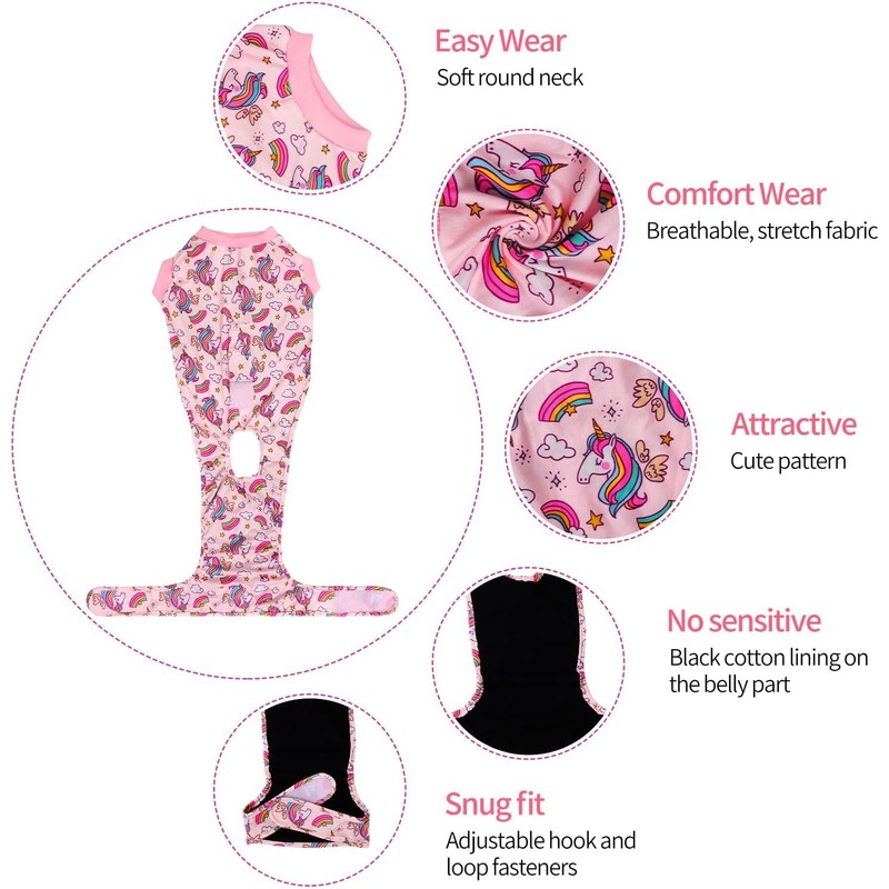 - DETACHABLE The rear end of the suit is easy to open and roll up, allowing pets to go to the toilet freely. 6. EFFECTIVE HELP Our recovery suit covers wounds, skin conditions, hot spots, allergies and infections and prevents pets from being affected by licking them. In this way, pets can recover quickly.