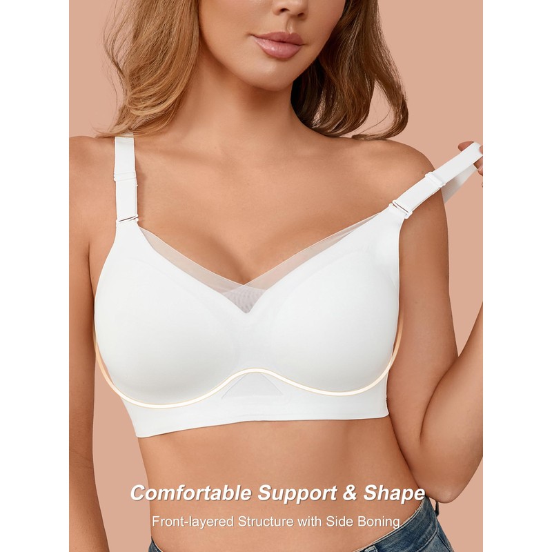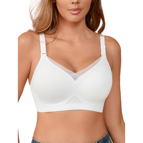 Cuteio Wireless Bras for Women No Underwire, Seamless V Neck Mesh Bralette with Support, Everyday Full Coverage Comfortable Bra White