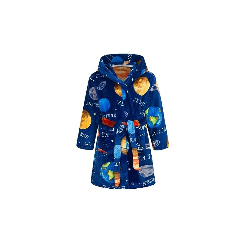 CuteOn Boys Girls Dressing Gown with Hood Soft Flannel Robe Casual Sleepwear for Children, Blue Planet