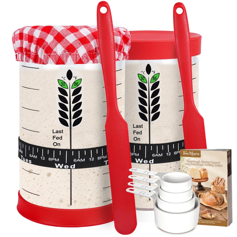 - 🍞【CUTERISE SOURDOUGH STARTER KIT 14PCS】:🎁❤️Perfect Mother's day Gifts! TeeMars sourdough starter kit has been widely praised, with valuable feedback, we launched the 14PCS CUTERISE sourdough jar kit to make delicious bread easy to create. It includes:2pack 40oz Glass Jars with 2pack Silicone Lids, 2pack 11" Silicone Spatulas, 2pack Feeding Time Trackers, 2pack Thermometers, 2pack Cute Breathable Cloth Covers, Measuring Cup Set, Sourdough Recipe.