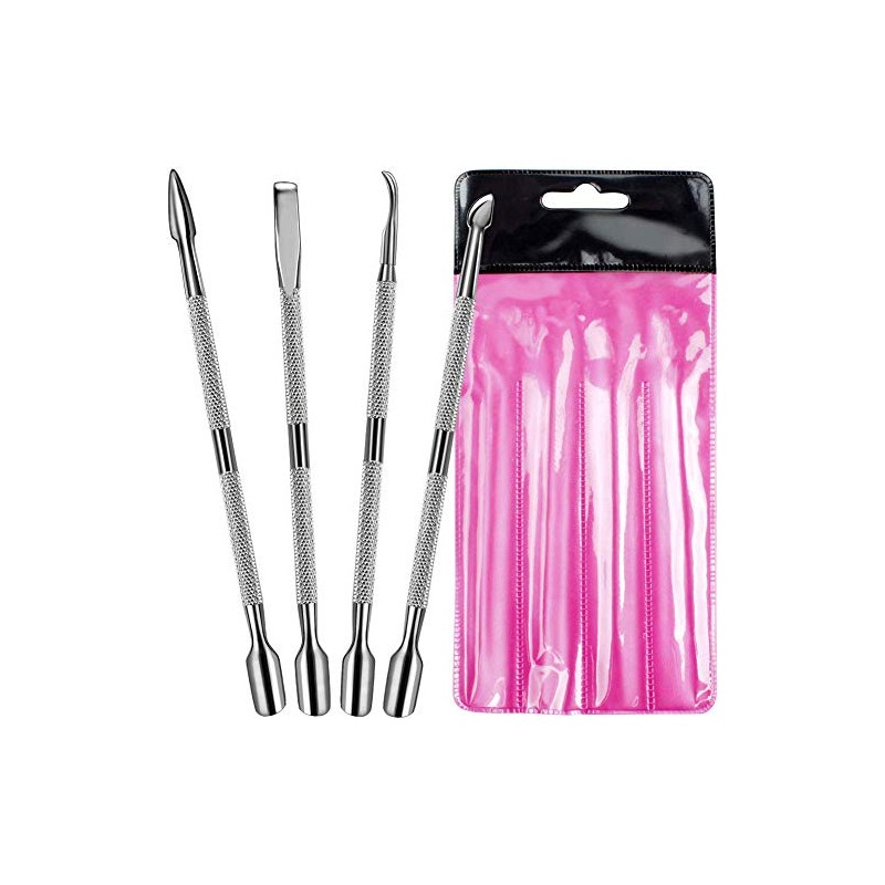 - 【2-in-1 Double Ended Cuticle Pusher Tool】 The spoon-like end (curved-end) is used for pushing cuticles - the design easily helps to shape the cuticles. The blade scrapes the hard-to-remove leftover skin residue on the nail and great for removing glue when using acrylic nails.