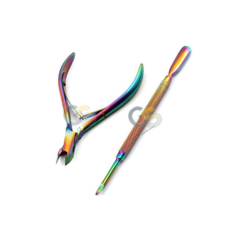 Cuticle Pusher Remover with Nipper Rainbow Stainless Steel Manicure Nail Art Tool Set #4 by G.S Online