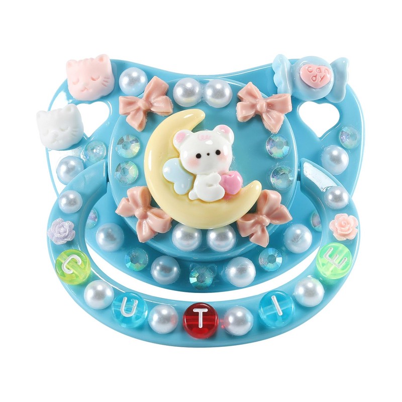 - Moon bear: With cute white bunnies, roses, blue sweets, small bows, pink heart sweets, white beads and colourful, shiny diamonds, hand-glued, the 'moon bear' letter colour is randomly combined.
