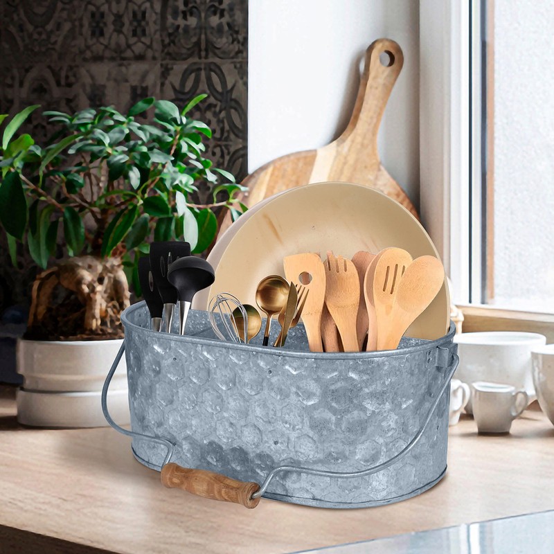 - PERFECT FOR EVERY PLACE : Anniversary, Holiday Housewarming or Birthday, Mother’s Day, wedding, bridal shower, or anything in between, this galvanized carry all makes a cute and functional gift. It looks great in the kitchen, living room, bedroom, office, bathroom or kid’s room. holding your hair brushes and curling irons in the bathroom, and even for cleaning supplies or gardening tools and accessories.Offering sufficient space, you can store your forks, spoons, kitchen gadgets, spatulas, utens