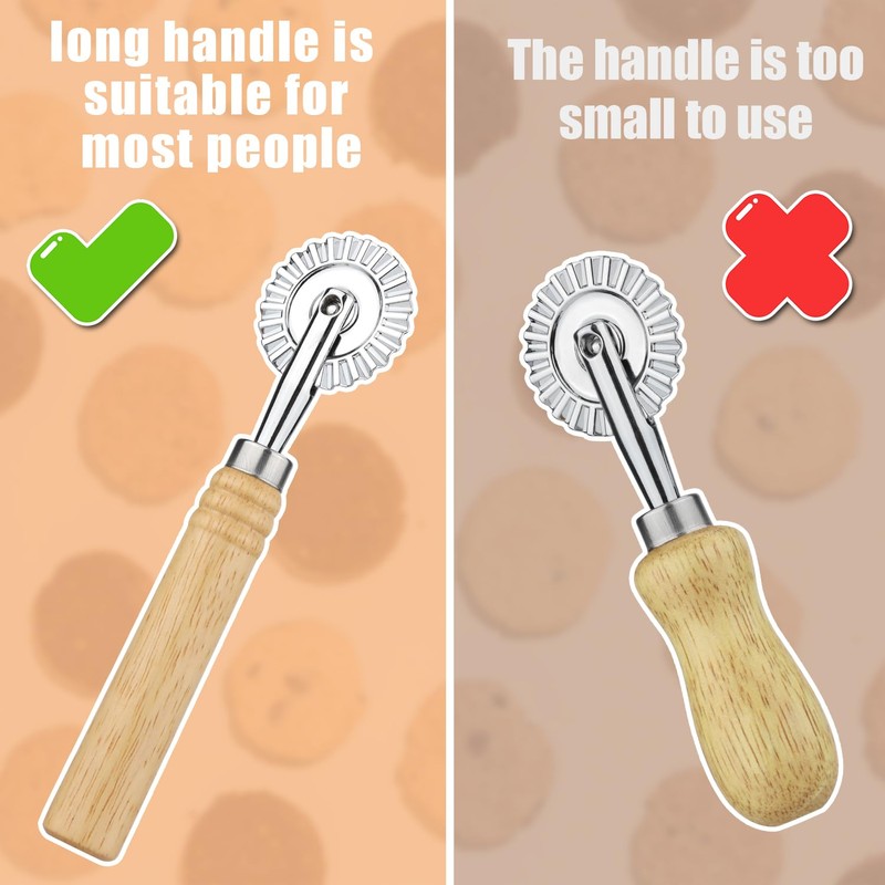 - LONG HANDLE The dough cutter wheel has a diameter of about 4 cm and a length of 16 cm. Long handle and comfortable handles make baking easier.