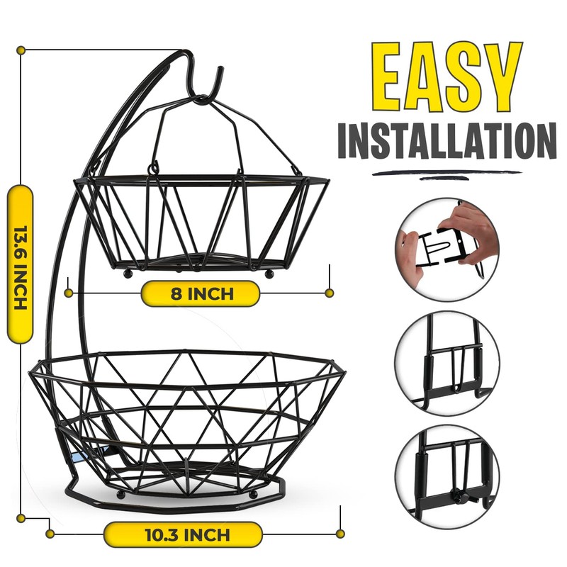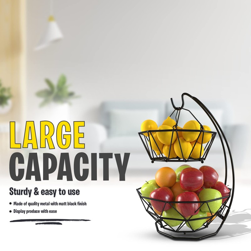 - Convertible and versatile – Three products in one! Separate the two fruit baskets and banana tree into three items. You can use the bigger basket as a fruit holder and the smaller basket as an egg holder. Or, you can use other items of your choice, like vegetables. Fruit Basket with Banana Hanger and Fruit Bowl (Black,2 -tier). Fruit bowl for kitchen counter with banana holder used as bread basket, vegetable basket, produce basket, fruit stand or egg holder.