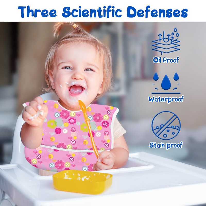 - [Fully waterproof]:This baby bib is made of high-quality lightweight PUL fabric, which is fully waterproof. In addition to being stain, oil and odor resistant, our bibs are BPA-free, phthalate-free, PVC-free, vinyl-free, and lead-free. Our baby bib keep food and liquids off the floor! Keep your baby's clothes, high chair, and floor clean after meals.