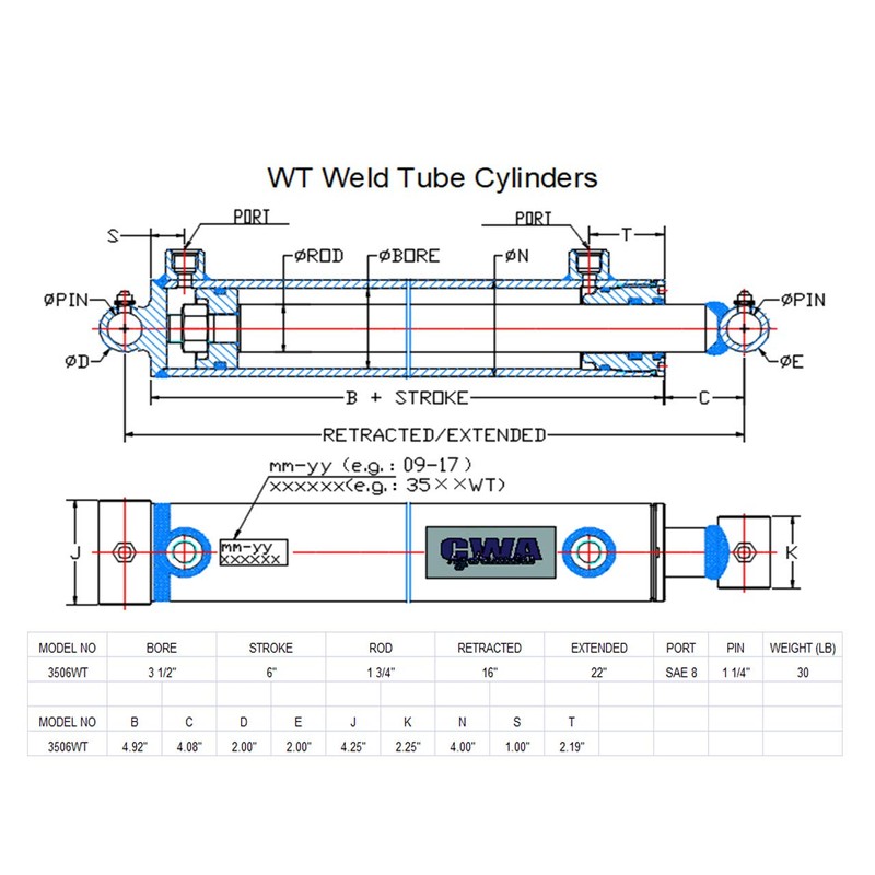 CWA Hydraulics WT Weld Cross Tube Hydraulic Cylinder 3 1/2" Bore x 6" Stroke x 1 3/4" Rod x SAE 8 Port x 3000 PSI