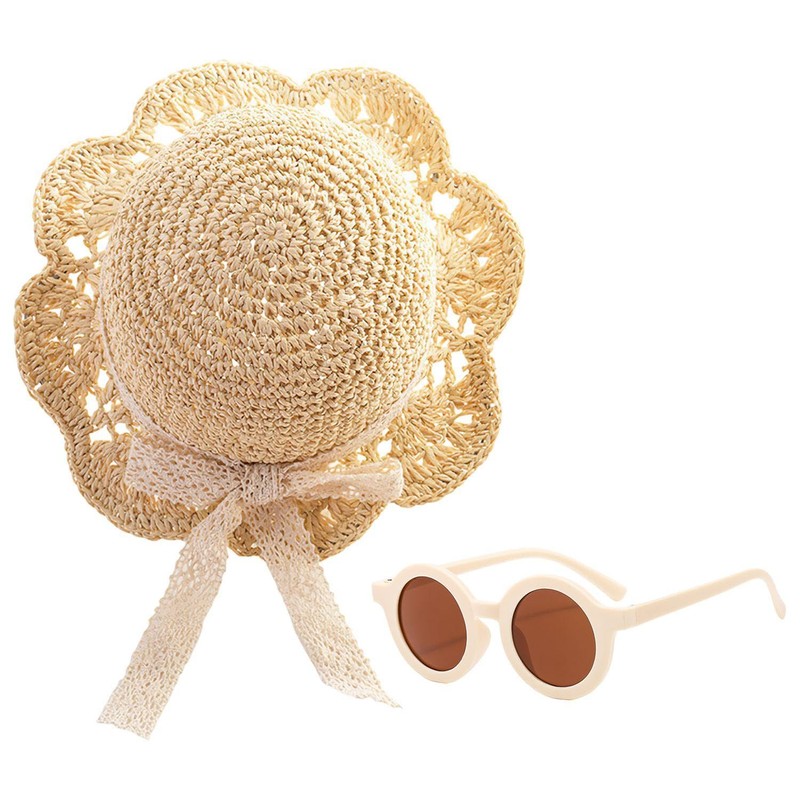 CWPFVQA 1 x Children's Straw Hat, 1 Pair of Sunglasses, Soft Straw Hat, Lace Straw Hat, Cute and Cute Straw Hat with Bow Decoration, Summer Beach Hat, cream-coloured
