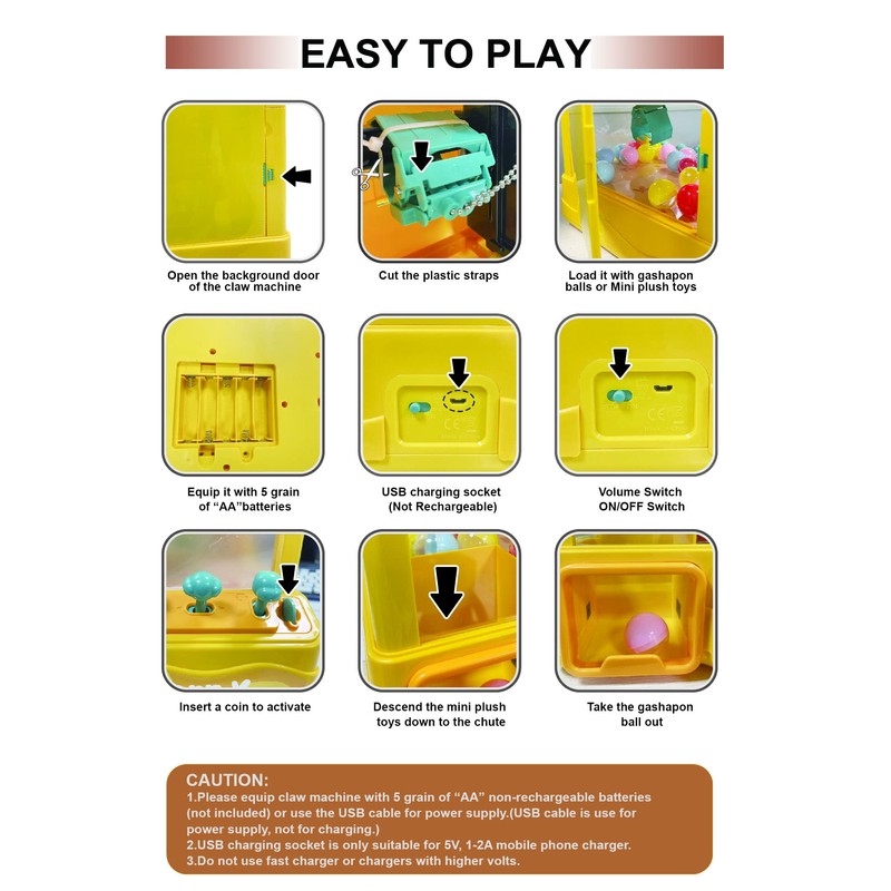 - 【Large Size & Two Power Supply Modes】The big claw machine come fully assembled, it measures 14.17 x 11.02 x 9.05 (H x L x W). 5 x “AA” batteries are required and not included. The USB cable (included) also can be used for power supply for long-time playing fun.