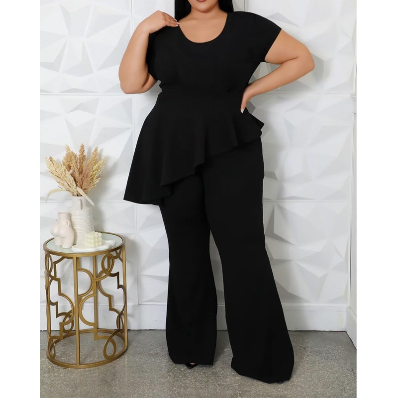- This solid irregular peplum tops and pants set is stretchy. The pants feature a high waist with an elastic waistband, ensuring comfort and a flattering fit for plus-size wearer; wide, straight-leg cut, combining comfort and elegance for a sophisticated, modern look.