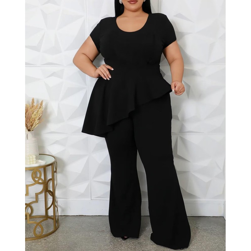 Women suits 2 piece set features:Plus Size / Asymmetrical Hem / Back Zipper / Peplum Tops / Short Sleeves Top / Scoop Round Crew Neck / Flared Stright Pants / Solid Color 2 Piece Pant Sets / Elastic High Waist Wide Leg Pant, Perfect for A Trendy and Relaxed Look.