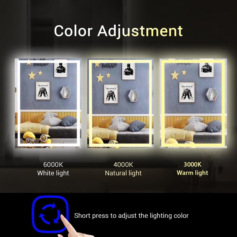 - Dimmable 3Color Temperature Mirror:With the touch of a button, our LED mirror allows you to adjust between three different color temperatures (color 3000K (warm light), 4000K (neutral light) and 6000K (white light) providing you with a lifelike and customizable lighting experience. Our smart memory function ensures that the mirror always remembers your best settings, helping you show your beautiful self
