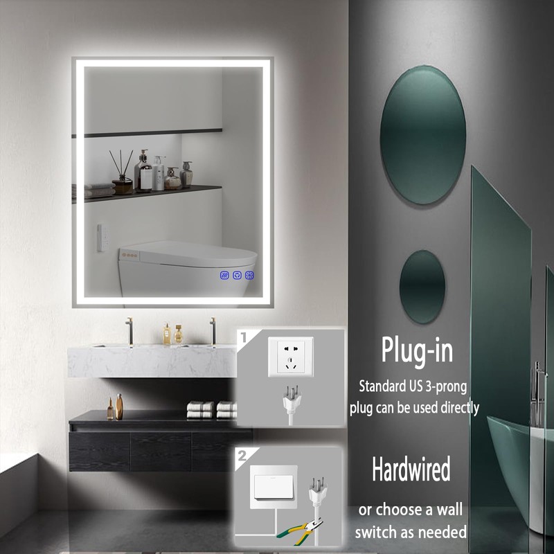 - Plug in or Wall Switch: With a standard 2-prong plug, you can plug directly into an outlet to use this lighted bathroom mirror, or hardwire it to control it via a wall switch. You can install it directly in the bathroom or bedroom,normal installation takes 5-8 minutes,Both hardwire and plug-in options are available,LED Vanity mirrors last over 75,000 hours, no wiring modifications are required.The back of the smart mirror is an oxidized aluminum alloy frame, providing durability and reliability