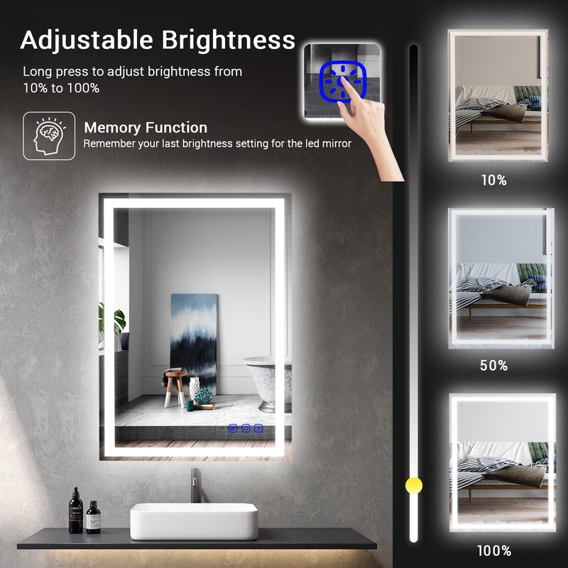 - HD Adjustable Brightness: Bathroom Mirror Are Designed With HD Glass And High-grade Matte Black Metal Craft Frame,Simple Design Endow The Mirror Anti-water,The Brightness Of This Bathroom Mirror Is Adjustable. Press And Hold The Light Button For 1 Second To Turn On/off The Mirror Light. Press And Hold The Light Button For 3 Seconds To Adjust The Brightness Of The Rearview Mirror (10% - 100%)
