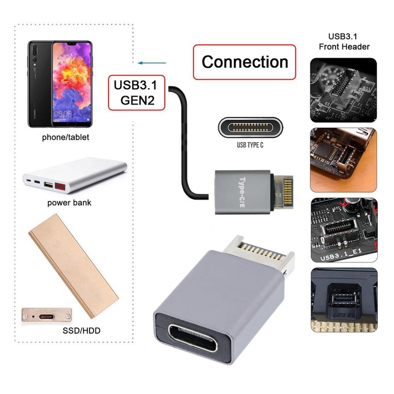 • CY Adapter USB 3.1 Front Panel Header Male Type-E to Type-C USB-C Female Motherboard Extension Data Adapter