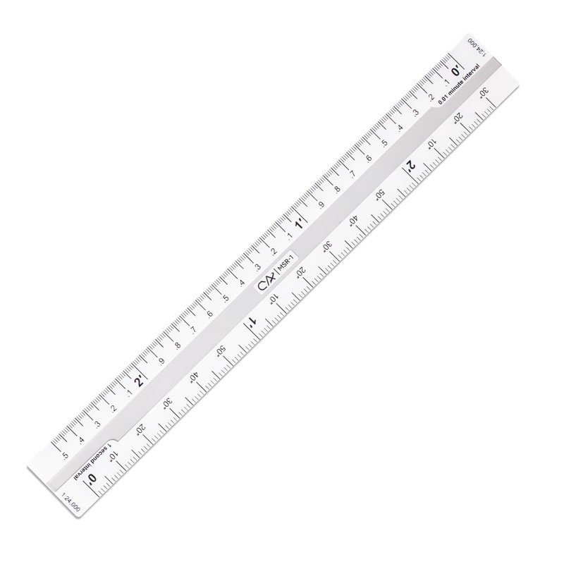 - On the front side, the ruler has minutes and seconds on one edge and decimal minutes on the other edge, allowing you to use either notation. 0.01 min & 1 sec
