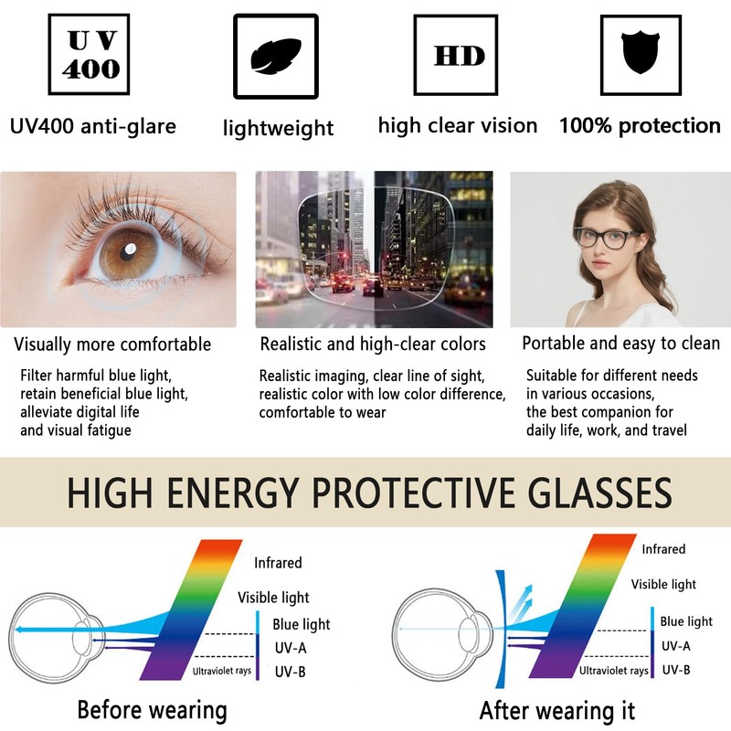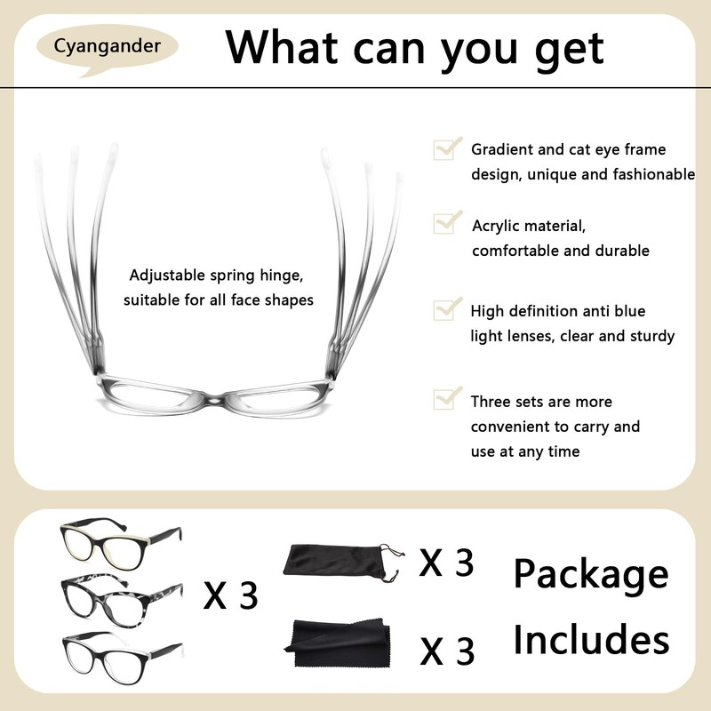 Cyangander Blue Light Readers: Your Go To Glasses for Effortless Reading!Tired of squinting your eyes at your phone or getting stuck in small fonts? Our 3 pairs of reading glasses are designed specifically for energetic women who pursue clarity and fashion. You can see clearly and feel lighter: the acrylic frame won't make you feel heavy. Anti glare lenses filter harmful blue light on the screen, providing clear text and vivid protection! Specially designed for real life: Whether you are working or resting, our reading glasses can provide you with the most thoughtful help 3 pairs without worries: never have to search for lost readers again! Put one pair into your fiber bag and the other pair in the car. The other pair should be placed at the bedside or wherever you need it. Important specifications: Intensity: Magnify by 1.0 to 4.0 degree (non prescription) Frame: Durable acrylic full frame reader with stylish cat eye style, high-end minimalist colors, and elegant appearance. Protection: 100% UV400 protection and blue/glare blocking Additional: Scratch resistant ultra-fine fiber cloth and fiber bag