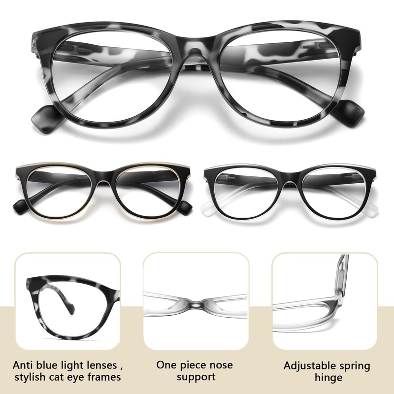 • 3-Pack Fashionable Women's Reading Glasses:equipped with spring hinges and acrylic frame.With our three pack full frame reading glasses, you can enjoy a clear and flawless view anywhere. These readers use a acrylic frame and clear lenses, which can effectively block 99% of blue light and glare from the screen, thereby reducing eye fatigue during reading or computer operation.