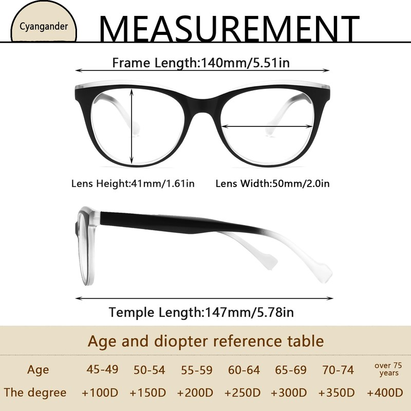 - Precise MagnificationandWorry Free Support: Our Cyangander women's fashionable reading glasses offer multiple magnification options for you to choose from: 1.00, 1.25, 1.50, 1.75, 2.00, 2.25, 2.50, 2.75, 3.00, 3.25, 3.50, 3.75, 4.00. For clear and distortion free vision. In the event of non-human damage, all of our Cyangander customers can enjoy 24-hour high-quality after-sales service if there are any issues. Customer satisfaction is our top priority.