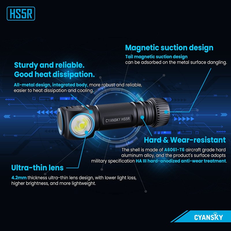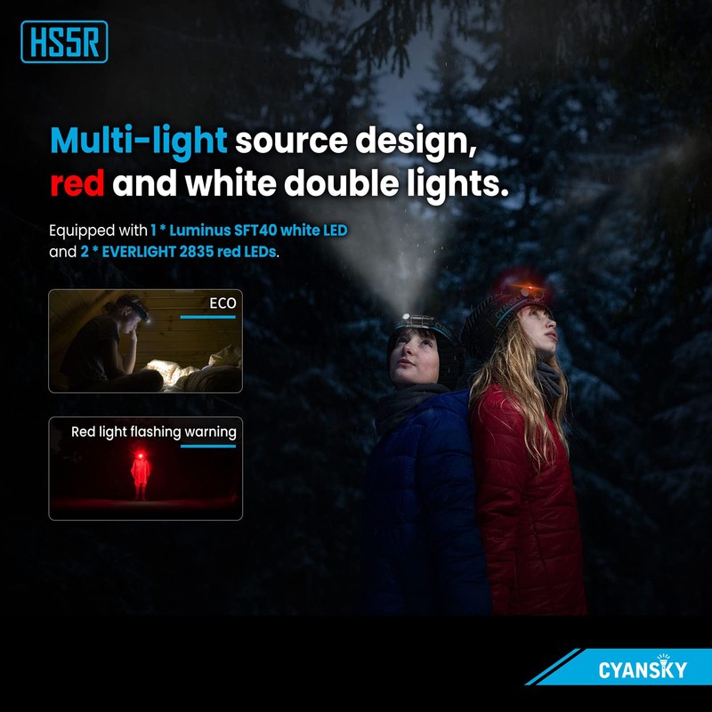 - BRIGHT MULTIFUNCTIONAL HEADLAMP - The Cyansky HS5R emits up to 1300 lumens with white light an auxiliary red light, ideal for outdoor activities such as jogging, hiking, camping, running.