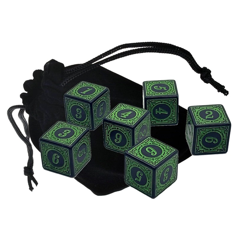 Cyber-Deals Set of (6) 16mm Dice 6-Sided D6 Numeral 1-6 Sides Squared Corners ... Plus Black Velvet Cloth Pouch Bag (Green)