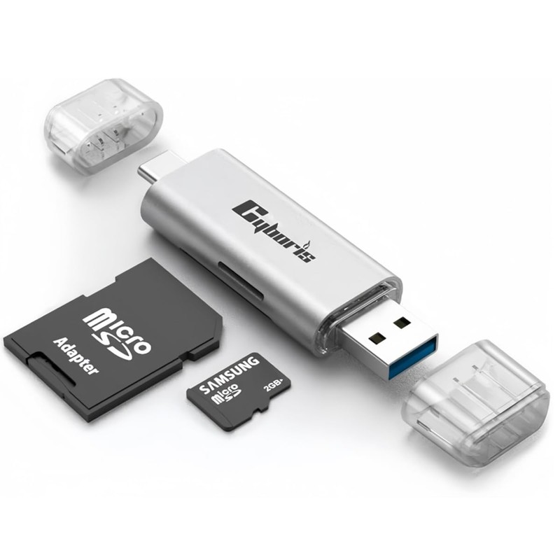 CYBORIS Micro SD Card Reader, USB 3.0 USB-C Memory Card Reader, Aluminum Multi 2-in-1 External SD Card Adapter for Phone Camera PC Laptop Table, Support TF/SD/Micro/SD/SDXC/SDHC/MMC/RS-MMC/UHS-I