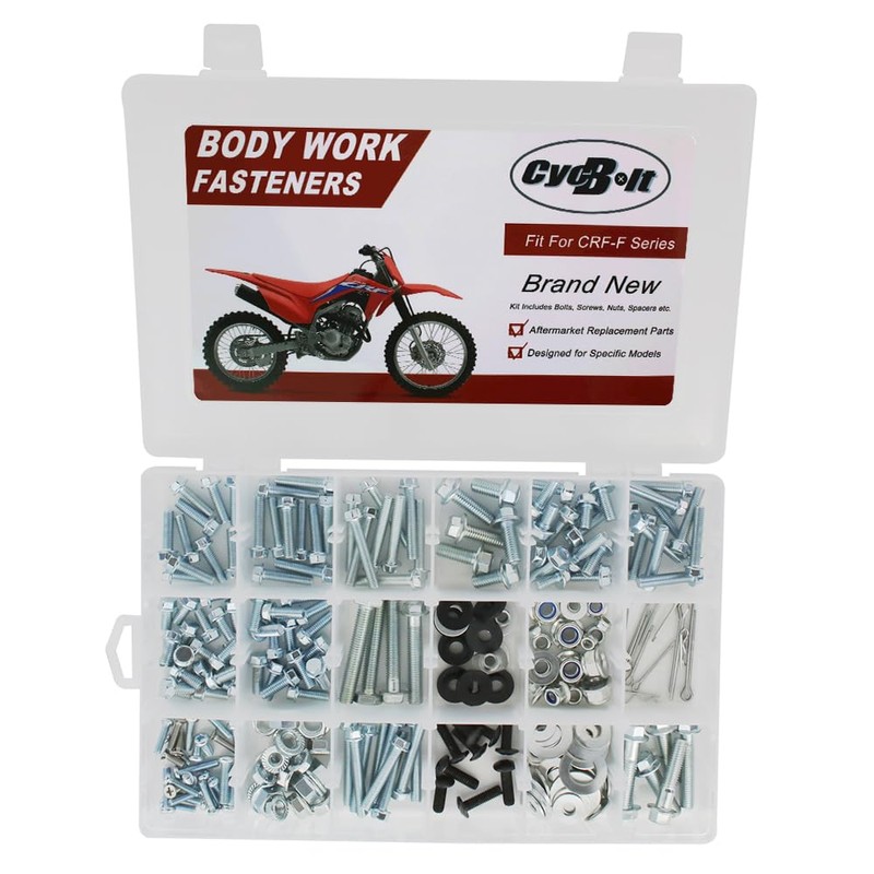 - CYCBOLT Body Work Fasteners Kit Is Designed for Use in the Repair, Maintenance, and Restoration of Motorcycle. The Old, Rusty Bolts can Be Replaced by This New High Hardness Anti-corrosion Bolt Kit Directly for Updating Motorcycle Apperance & Enhance The Riding Safety, A Great Addition to the Rider's Tool Kit.