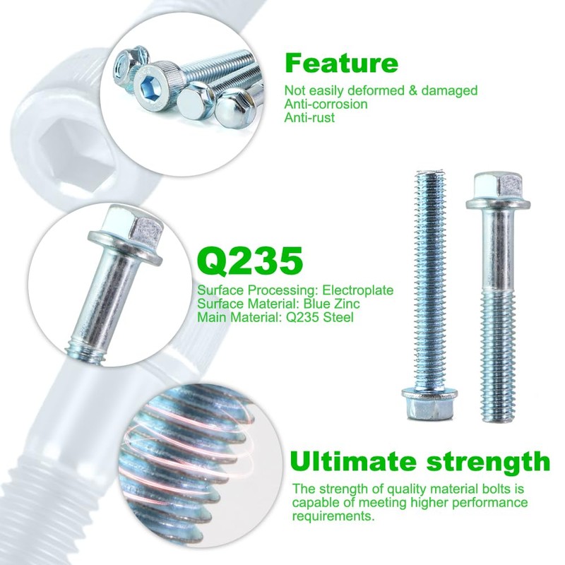 - Material: The Bolt Fastener Kits Are Made of Blue Zinc-Plated Q235 Steel, Features Rust-Proof, Moisture-Resistant, Oxidation-Resistant, and Corrosion-Resistant Properties, Ensuring Reliable Performance.
