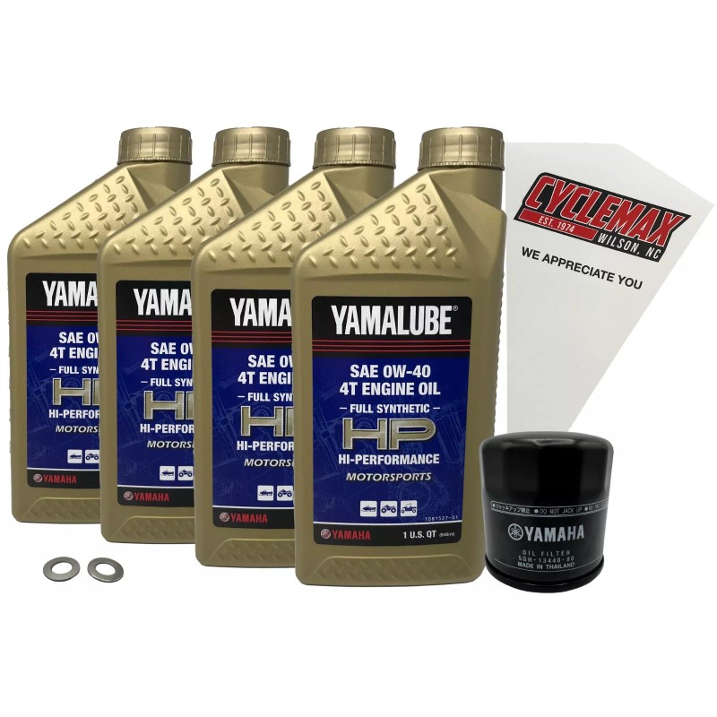 - CYCLEMAX OIL CHANGE KIT INCLUDES: Four Yamaha LUB-00W40-FS-12 Yamalube Full Synthetic 0W40 Quarts of Oil, One Yamaha 5GH-13440-80-00 Oil Filter, Two 10mm Drain Plug Crush Washers and a Convenient Disposable Funnel.