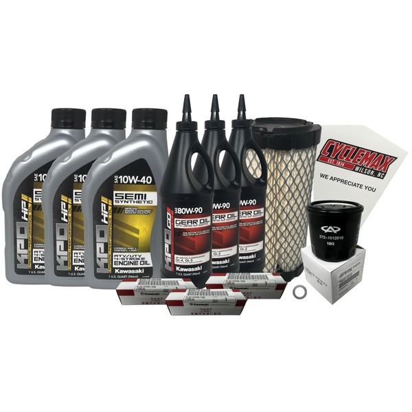 - CYCLEMAX FULL SERVICE KIT INCLUDES: Three Kawasaki K61027-300-01Q KPO Semi-Synthetic ATV/UTV 10W40 01Q Quarts of Oil, Three Kawasaki K6103G-103-01Q KPO Gear Oil, One Kawasaki 16097-0010 Oil Filter, One Kawasaki 11013-1290 Air Filter, Three Kawasaki 92070-0048 Spark Plugs, One 12mm Drain Plug Crush Washer and a Convenient Disposable Funnel.