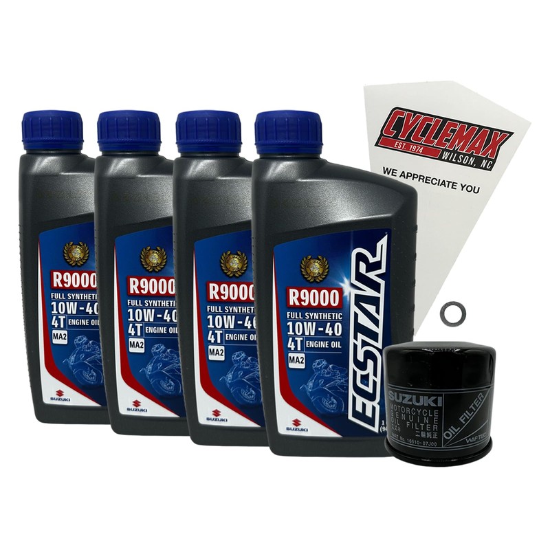 - CYCLEMAX OIL CHANGE KIT INCLUDES: Four Suzuki 990A0-01E40-01Q Ecstar R9000 10W40 Quarts of Oil, One Suzuki 16510-07J00 Oil Filter and a Convenient Disposable Funnel.