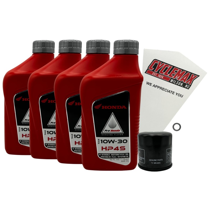 - CYCLEMAX KIT INCLUDES: Four Honda 08C35-A14W0M HP4 Semi Synthetic 10W40 Quarts of Oil, One Honda 15410-MFJ-D02 Oil Filter, One 12mm Drain Plug Crush Washer and a Convenient Disposable Funnel.
