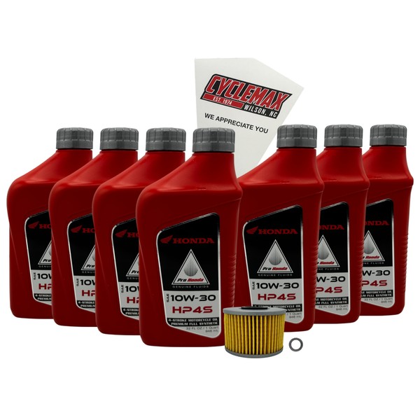 - CYCLEMAX KIT INCLUDES: Seven Honda 08C35-SYN HP4s Full Synthetic 10W30 Quarts of Oil, One Honda 15412-HP7-A01 Oil Filter, One 12mm Drain Plug Crush Washer and a Convenient Disposable Funnel.