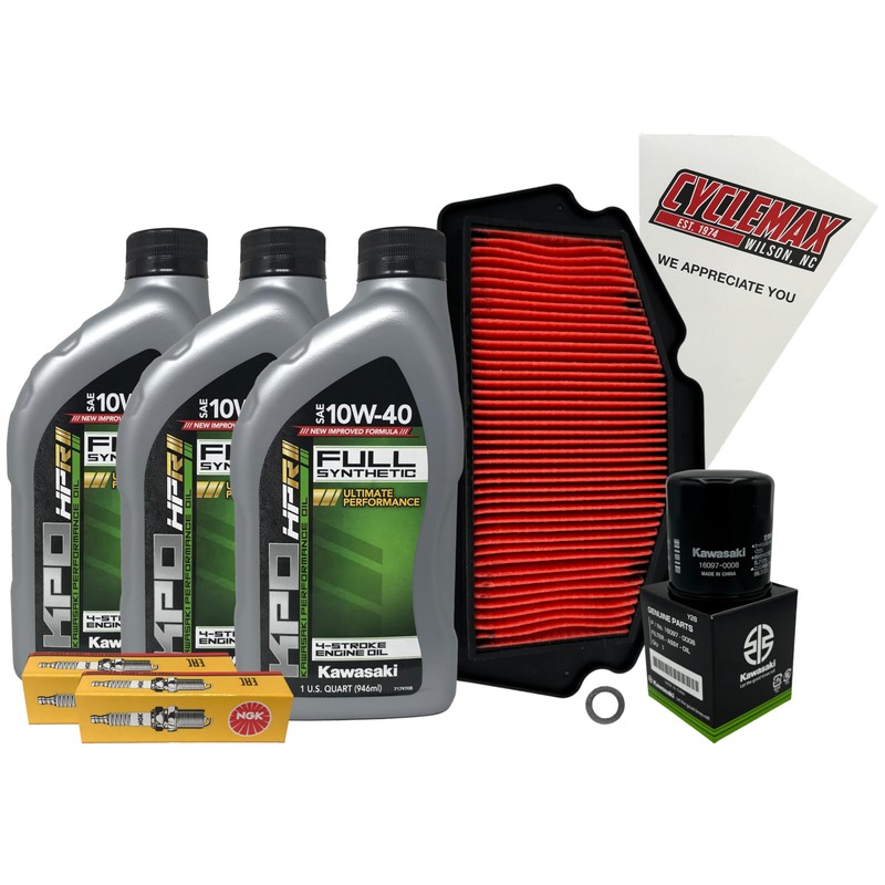 - CYCLEMAX KIT INCLUDES: Three Kawasaki K61021-300-01Q KPO Semi Synthetic 10W40 Motorcycle Quarts of Oil, One Kawasaki 16097-0008 Oil Filter, One Kawasaki 11013-0767 Air Filter, Two LMAR9G NGK Spark Plugs, One 12mm Drain Plug Crush Washer and a Convenient Disposable Funnel.