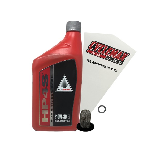 - CYCLEMAX KIT INCLUDES: One Honda 08C35-SYN HP4s Full Synthetic 10W40 Quart of Oil, One Honda 15421-K0R-V00 Oil Filter, One 12mm Drain Plug Crush Washer and a Convenient Disposable Funnel.