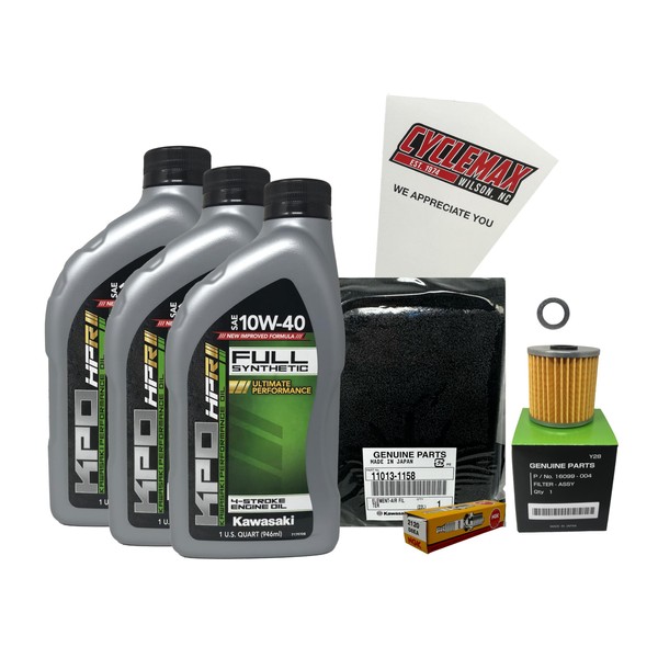 - CYCLEMAX TUNE UP KIT INCLUDES: Three Kawasaki K61021-500-01Q KPO Full Synthetic 10W-40 Quarts of Oil, One Kawasaki 16099-004 Oil Filter, One Kawasaki 11013-1158 Air Filter, One D8EA NGK Spark Plug, One 12mm Drain Plug Crush Washer and a Convenient Disposable Funnel.