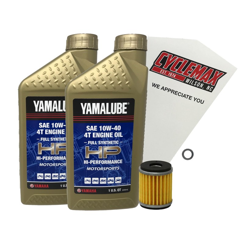 - CYCLEMAX KIT INCLUDES: Two Yamaha LUB-10w40-AP-12 Yamalube 10W40 Quarts of Oil, One Yamaha 1S7-E3440-00-00 Oil Filter, One 12mm Drain Plug Crush Washer and a Convenient Disposable Funnel.