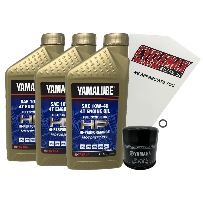 - CYCLEMAX OIL CHANGE KIT INCLUDES: Three Yamaha LUB-10W40-FS-12 Yamalube Full Synthetic 10W40 Quarts of Oil, One Yamaha 5GH-13440-80-00 Oil Filter, One 12mm Drain Plug Crush Washer and a Convenient Disposable Funnel.