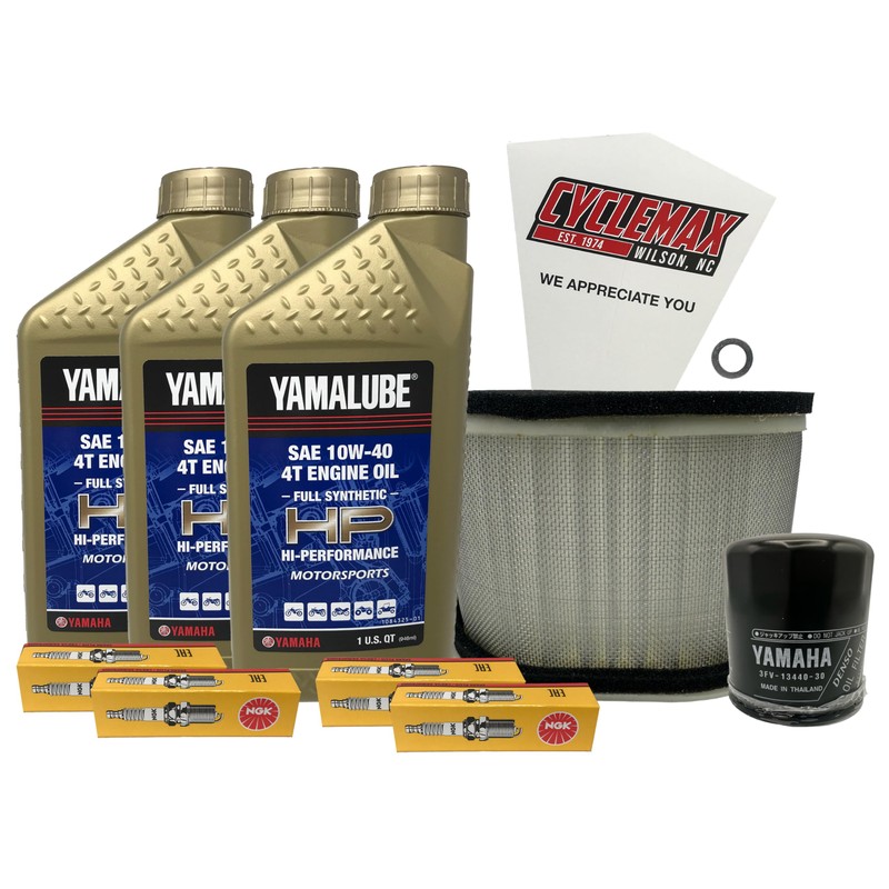 - CYCLEMAX OIL CHANGE KIT INCLUDES: Three Yamaha LUB-10W40-FS-12 Yamalube Full Synthetic 10W40 Quarts of Oil, One Yamaha 3FV-13440-30-00 Oil Filter, One Yamaha 4JH-14451-00-00 Air Filter, Four CR9E NGK Spark Plugs, One 14mm Drain Plug Crush Washer and a Convenient Disposable Funnel.